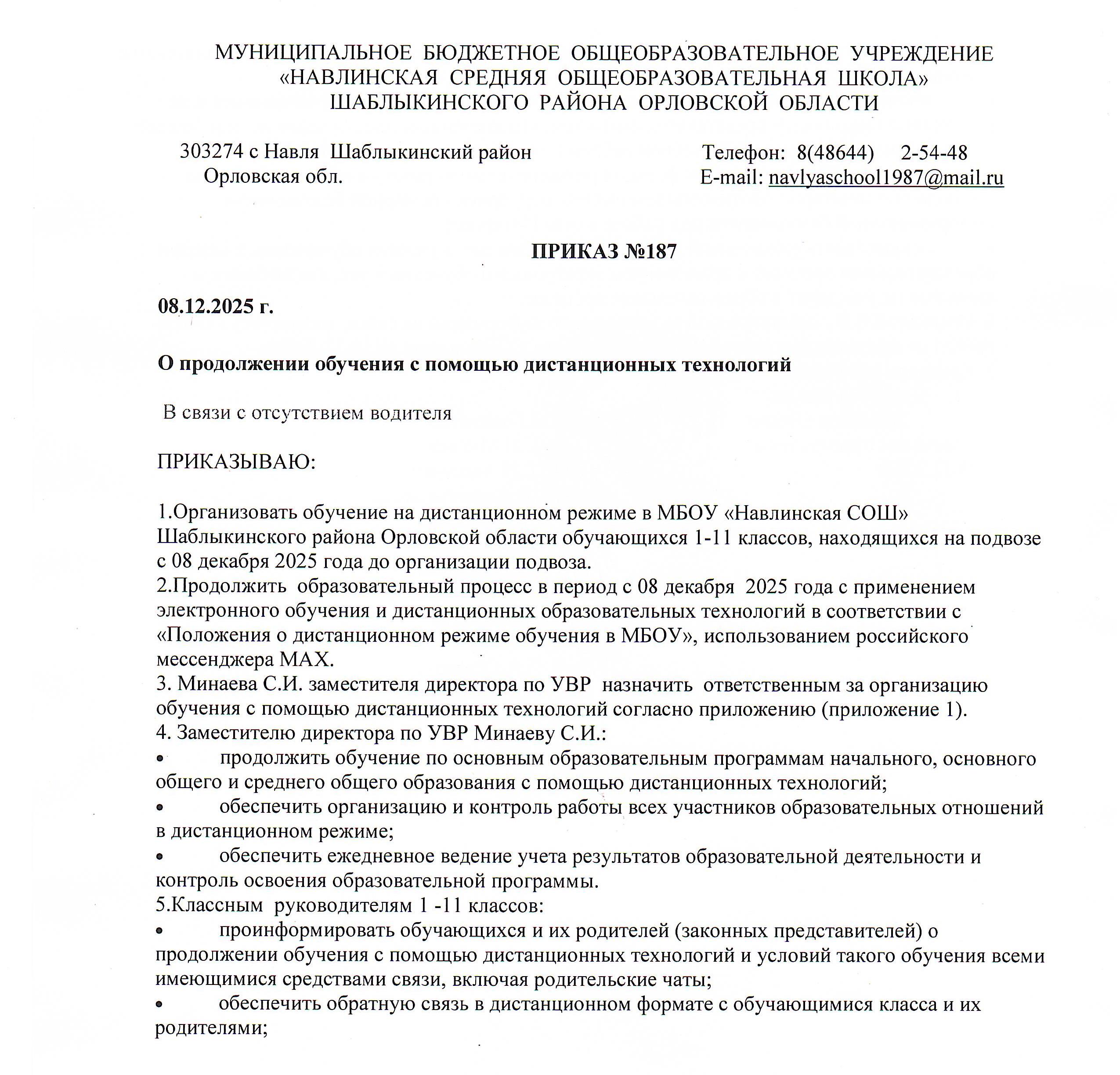 О продолжении обучения с помощью дистанционных технологий В целях обеспечения соблюдения Федерального закона от 30.03.1999 № 52-ФЗ «О санитарно-эпидемиологическом благополучии населения», постановлений Главного государственного санитарного врача РФ от 24.01.2020 № 2 «О дополнительных мероприятиях по недопущению завоза и распространения новой коронавирусной инфекции, вызванной 2019-nCoV», от 02.03.2020 № 5 «О дополнительных мерах по снижению рисков завоза и распространения новой коронавирусной инфекции (2019-nCoV)», с учетом письма Федеральной службы по надзору в сфере защиты прав потребителей и благополучия человека от 23 января 2020 г. № 02/776-2020-23 «О профилактике коронавирусной инфекции», приказа Минобрнауки России от 29 января 2020 г. № 146 «О мерах по предупреждению распространения коронавирусной инфекции», Письма ФМБА России от 28.02.2020 № 32-024/159 «О дополнительных мерах по профилактике COVID-2019, в соответствии с приказом Министерства Просвещения Российской Федерации « 104 от 17 марта 2020 г «Об организации образовательной деятельности в организациях, реализующих образовательные программы начального общего, основного общего и среднего общего образования, образовательные программы среднего профессионального образования, соответствующего дополнительного профессионального образования и дополнительные общеобразовательные программы, в условиях распространения новой коронавирусной инфекции на территории Российской Федерации», на основании «Положения о дистанционном режиме обучения в МБОУ «Навлинская СОШ» и в целях предупреждения распространения новой коронавирусной инфекции, вызванной COVID-19 и просто инфекции; ПРИКАЗЫВАЮ: 1.Продолжить обучение на дистанционном режиме в МБОУ «Навлинская СОШ» Шаблыкинского района Орловской области обучающихся 5-11 классов с 21 декабря по 25 декабря 2020 года. 2.Продолжить образовательный процесс в период с 21 декабря по 25 декабря 2020 года с применением электронного обучения и дистанционных образовательных технологий в соответствии с «Положения о дистанционном режиме обучения в МБОУ». 3. Минаева С.И. заместителя директора по УВР назначить ответственным за организацию обучения с помощью дистанционных технологий согласно приложению (приложение 1). 4. Заместителю директора по УВР Минаеву С.И.: