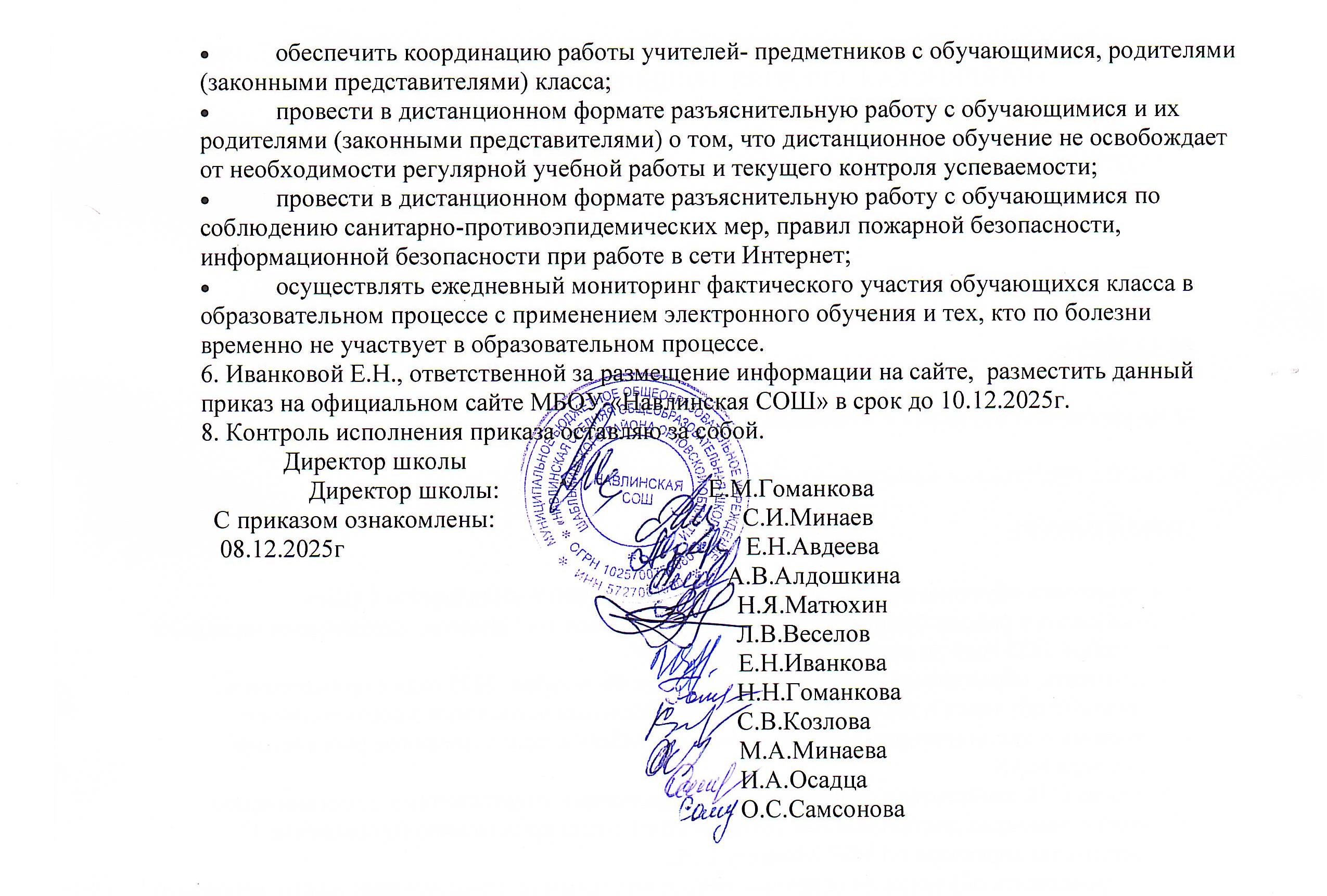 7. Учителю информатики Матюхину Н.Я разместить данный приказ на официальном сайте МБОУ «Навлинская СОШ» в срок до 18.12.2020. 8. Контроль исполнения приказа оставляю за собой.